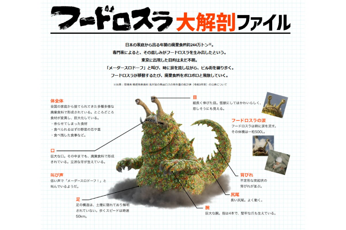 日本の家庭における、年間約244万トンにも及ぶフードロスについて周知し、その解決を呼びかける味の素(株)のプロジェクト。家庭から出る廃棄食品から生まれた巨大怪獣「フードロスラ」を撃退することで、フードロスのない地球を取り戻すことを目指す。