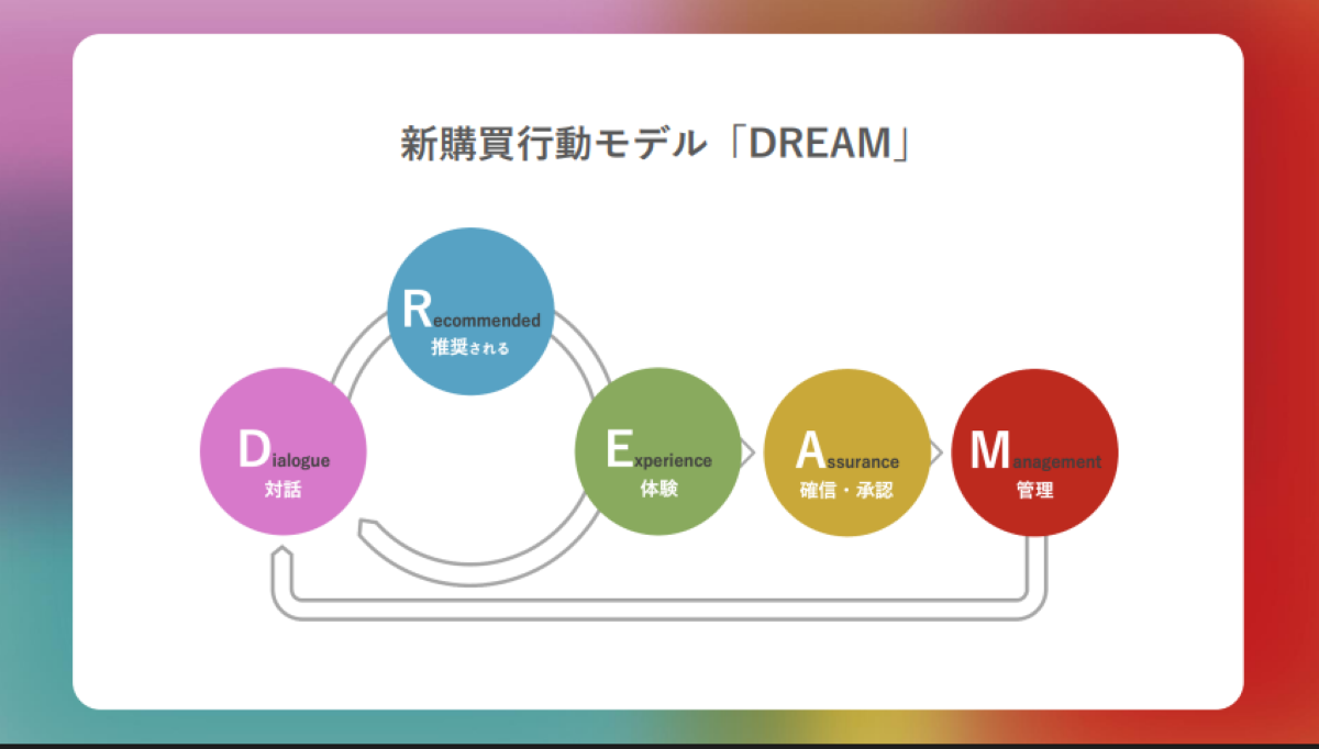 それから直近では、1月に、AIエージェントと暮らす時代の新しい購買行動モデル「DREAM」を発表しました。Dは Dialogue(対話)、RはRecommended(推奨される)EはExperience(体験)、Aは Assurance(確信/承認)、MはManagement(管理)を指しています。それぞれ簡単に説明すると、Dは、AIエージェントと対話して自分のニーズを理解したり、選択するポイントを知るというフェーズ。Rは、その対話を通してどんなものが欲しいかが明確になった後に、AIエージェントから具体的に商品をおすすめされるフェーズ。Eは、店頭やVRARなどで商品を試すフェーズ。Aは、試した結果、確信して買物を承認するフェーズ。Mは、使った後に、その商品の評価をAIエージェントにフィードバックして、次の買物の対話につなげていくフェーズです。