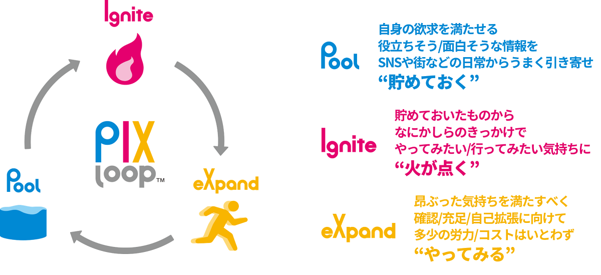 ちょうどその頃、メディア環境研究所が「情報引き寄せ」という概念を提唱したんです。スクショやフォローなどを通じて自分に有益な情報が自然とたまるようにするという、スマホ・ネイティブな世代の間で一般化している行動のことで、ここにこれからの情報行動の神髄があると思った。そこから、「情報引き寄せ」についてさらに我々の方で深掘りし、生まれたのが「PIXループ」です。
