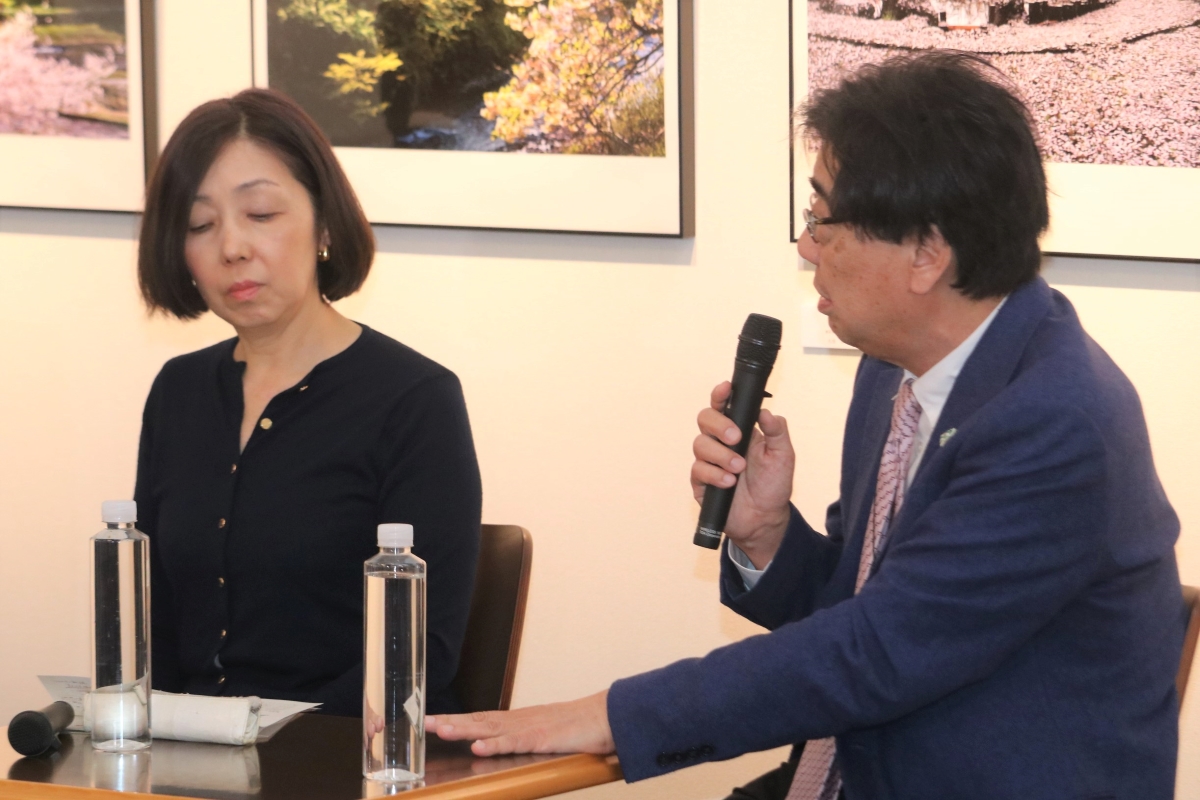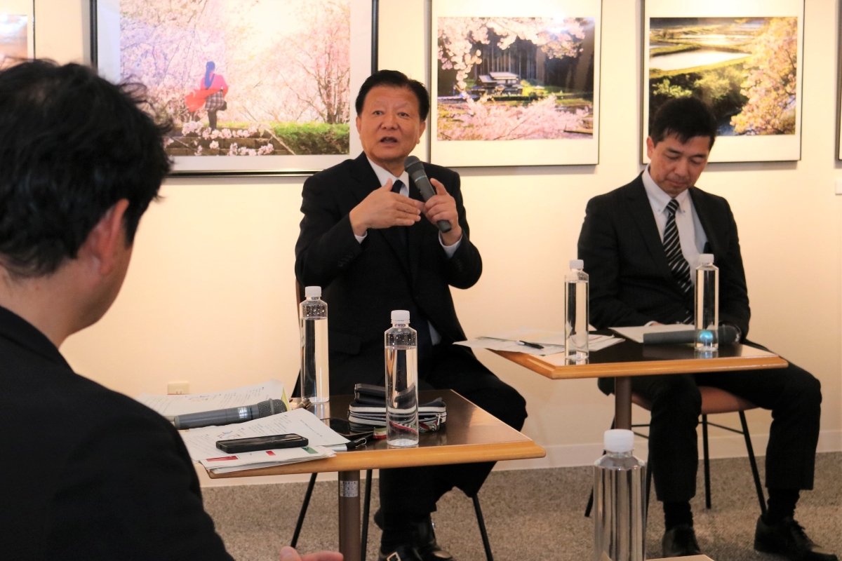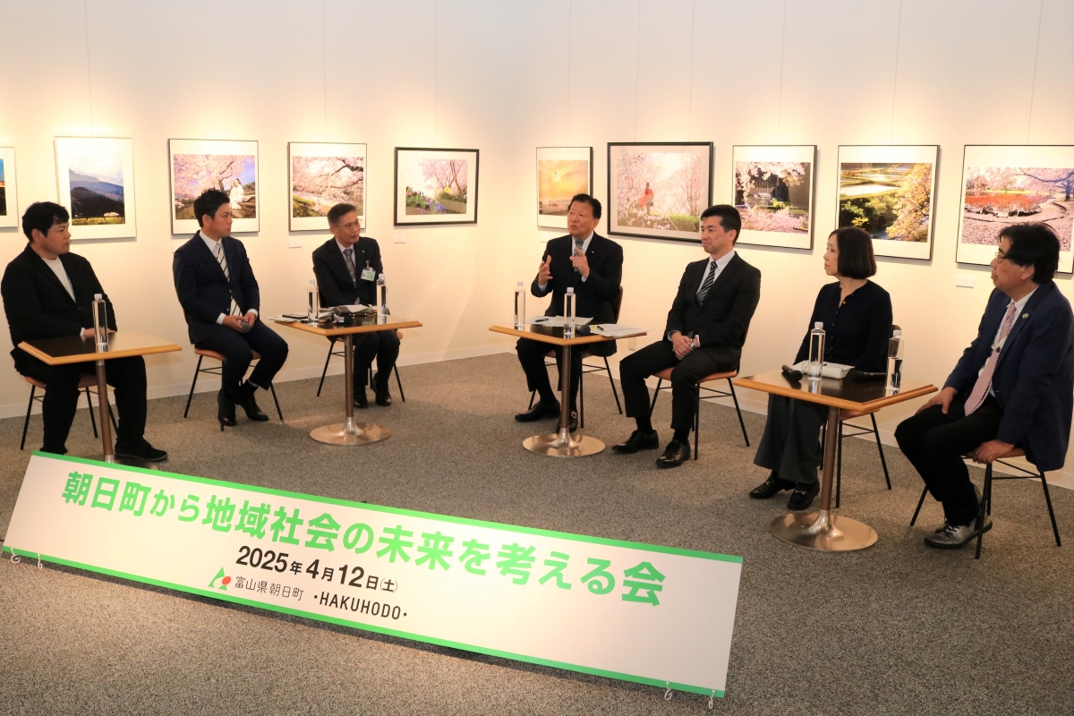 「春の四重奏」として親しまれる朝日町・舟川べりの桜並木が満開を迎えた4月12日。座談会は「朝日町から地域社会の未来を考える会」と題し、町ふるさと美術館で開かれた。