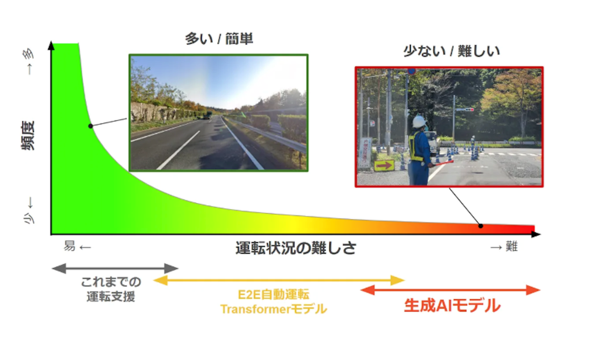 運転も、いわゆるロングテール現象が起こるんですよね。つまり、白線があるだけのシンプルな道のような「よくある運転パターン」の予測は簡単。