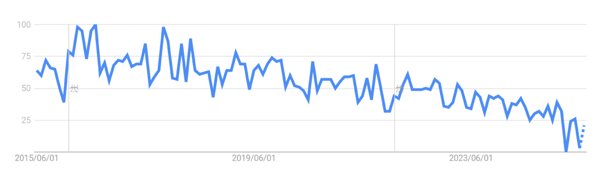 実際にシンプルなファッションのニーズが高まっているのか調べてみると、「ファッション 派手」の検索数が、直近10年間で緩やかに減少しているのに加え、2025年に入ったあたりからさらに検索数は減少しており、ファッションに対して派手さを求める傾向がダウントレンドであることがわかりました。