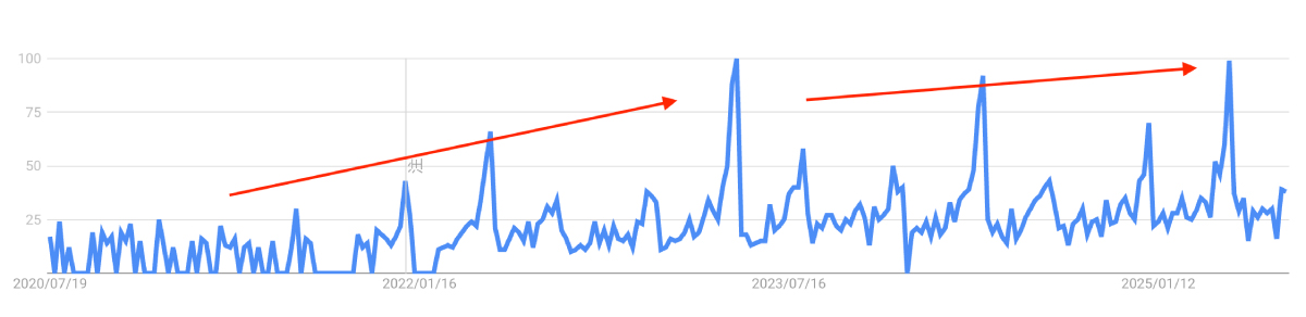 そこでGoogleトレンドで「混まない」と調べると、2022年頃から検索数が一気に増加し、その後もアップトレンドであることが分かりました。