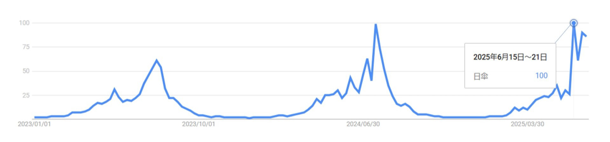 実際「日傘」の検索推移を見てみると、過去2年間では7月後半に最も大きな山がきていたのですが、今年は早く6月から、より大きく注目されていることが分かります。