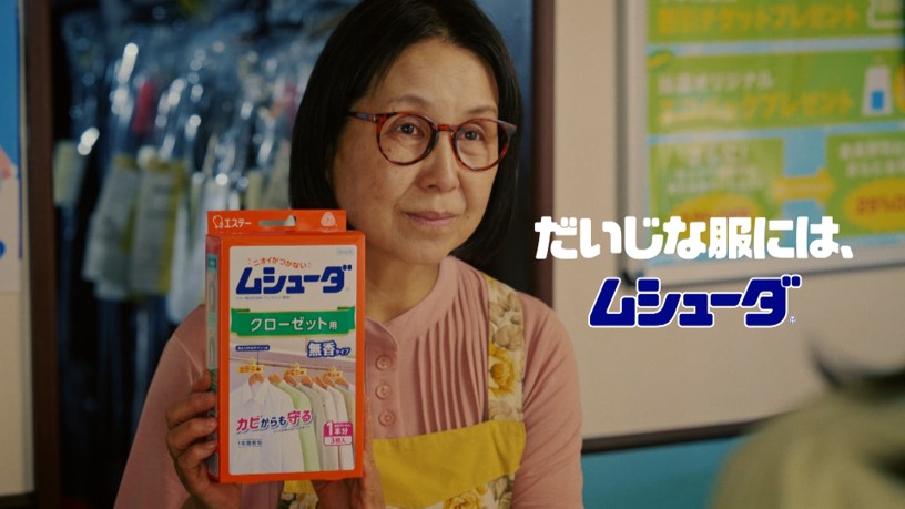 だいじな服を虫から守るムシューダ。だいじな服か否か。それって、クリーニングに出す服かどうかという判断基準が実感しやすいと思いました。クリーニングに出すような服には、ムシューダ、と。だから舞台は、いつものクローゼットの中ではなく、クリーニング屋さん。店員さんとお客さんのすこしシュールな会話が繰り広げられます。おなじみの、においがつかないムシューダ♪のサウンドロゴも今回のタグラインに合わせてマイナーチェンジを。
