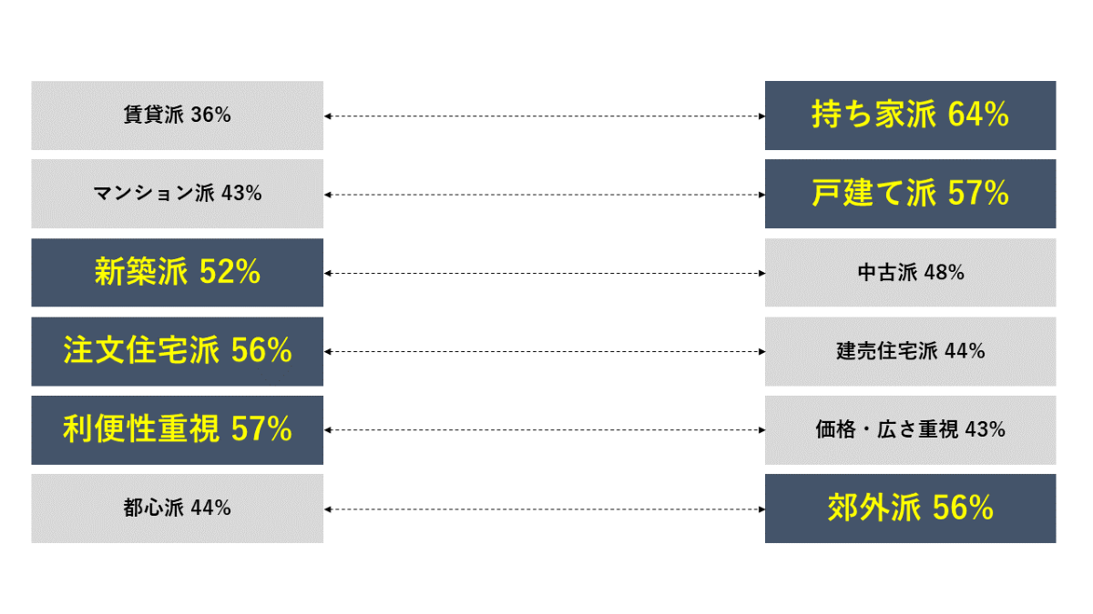 理想とする住宅タイプについては、各々拮抗しつつも「持ち家」「戸建て」「新築」「注文住宅」「利便性(駅近など)」「郊外」を理想とする傾向が多く見られます。