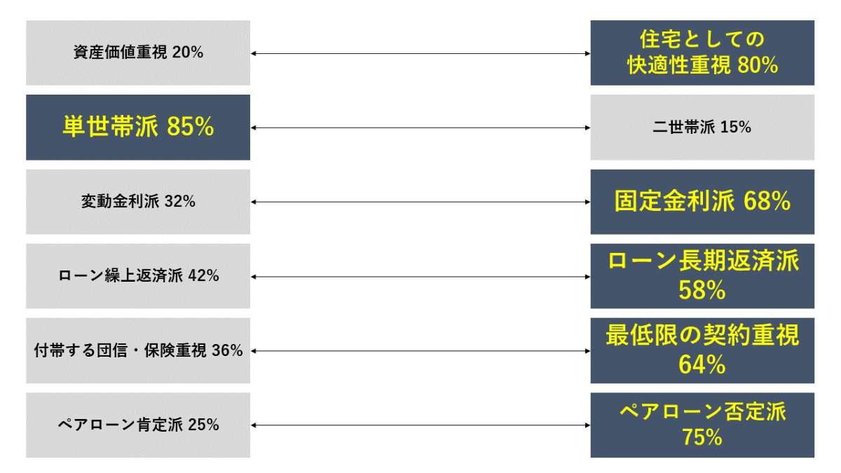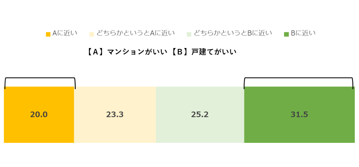 反対に、中間択の選択が少なかった(=明確に答えが決まっている)設問は「マンションか、戸建てか」という設問でした。生活者各々に解像度の高い理想の住まいはあるものの、昨今の状況や先の読めない経済状況の中では、どのような返済設計が正解なのか確信を持てず、ハードルを感じている人が少なくないことが分かります。