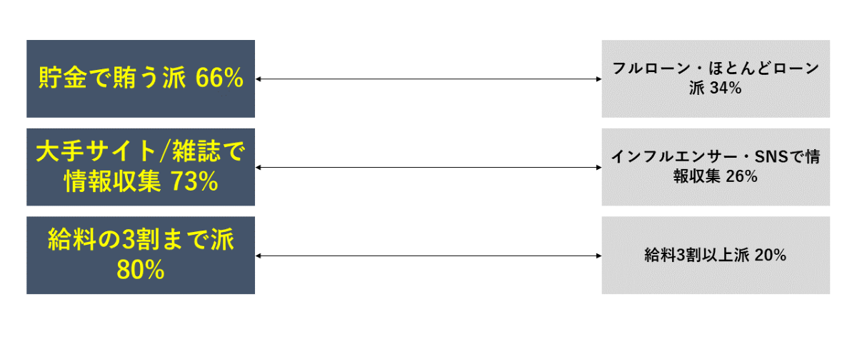 住宅に目を向けると「アドレスホッパーが増えている」「不動産投資が増えている」…など、センセーショナルなトピックが多く目に入りますが、それでもこうしてデータを見ると、まだまだ「堅実な様子見」勢が多くを占めていることが分かります。今後下がるかも分からない住宅価格と、堅実な返済プランを考えている生活者の間にある溝にどう働きかけることができるのかというのは今後の課題点です。