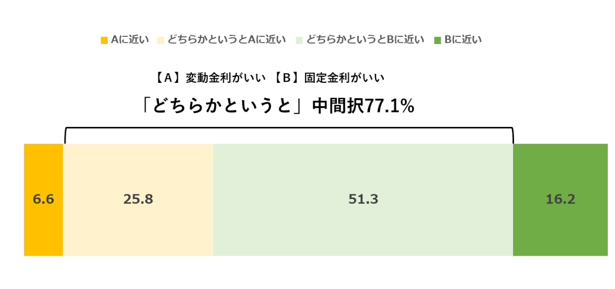 ちなみに、本調査では前述の二律背反質問を「Aに近い」「どちらかといえばAに近い」「どちらかといえばBに近い」「Bに近い」の4段階で聴取しました。その中で、「どちらかといえば」の中間択が最も多かった(=悩んでいる/確信が持てない)のは「変動金利か、固定金利か」という設問でした。