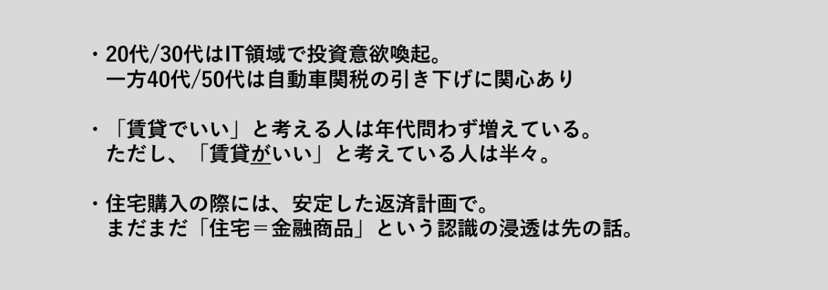 資産運用やローンの借り入れの傾向を見ると、「固定金利」「頭金」「給料の3割まで」と、変動する経済状況の中でも影響されない安定した返済計画を望んでいる傾向が強く出ています。日本人の将来予測ができないことに対する嫌悪感や恐怖感がここに現れており、この資産運用機運が高まっている時代にも関わらず、住宅を資産運用のいち商品として捉えることはまだまだ遠い先の話になりそうです。