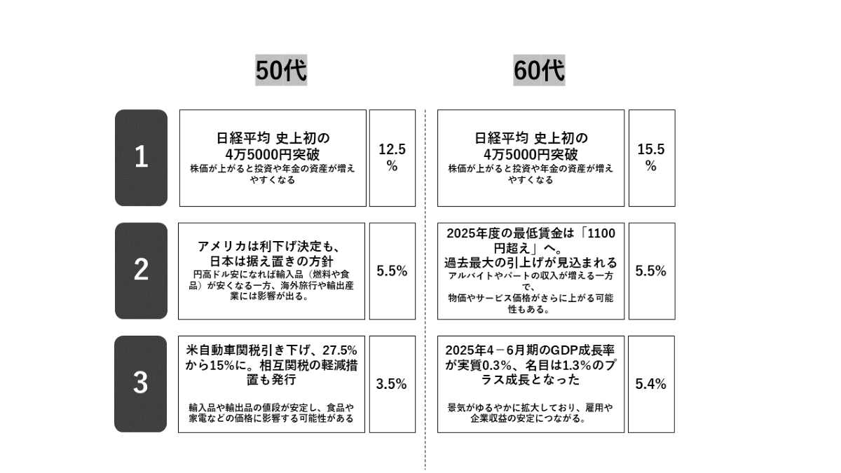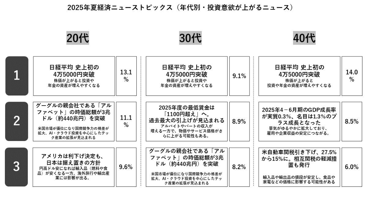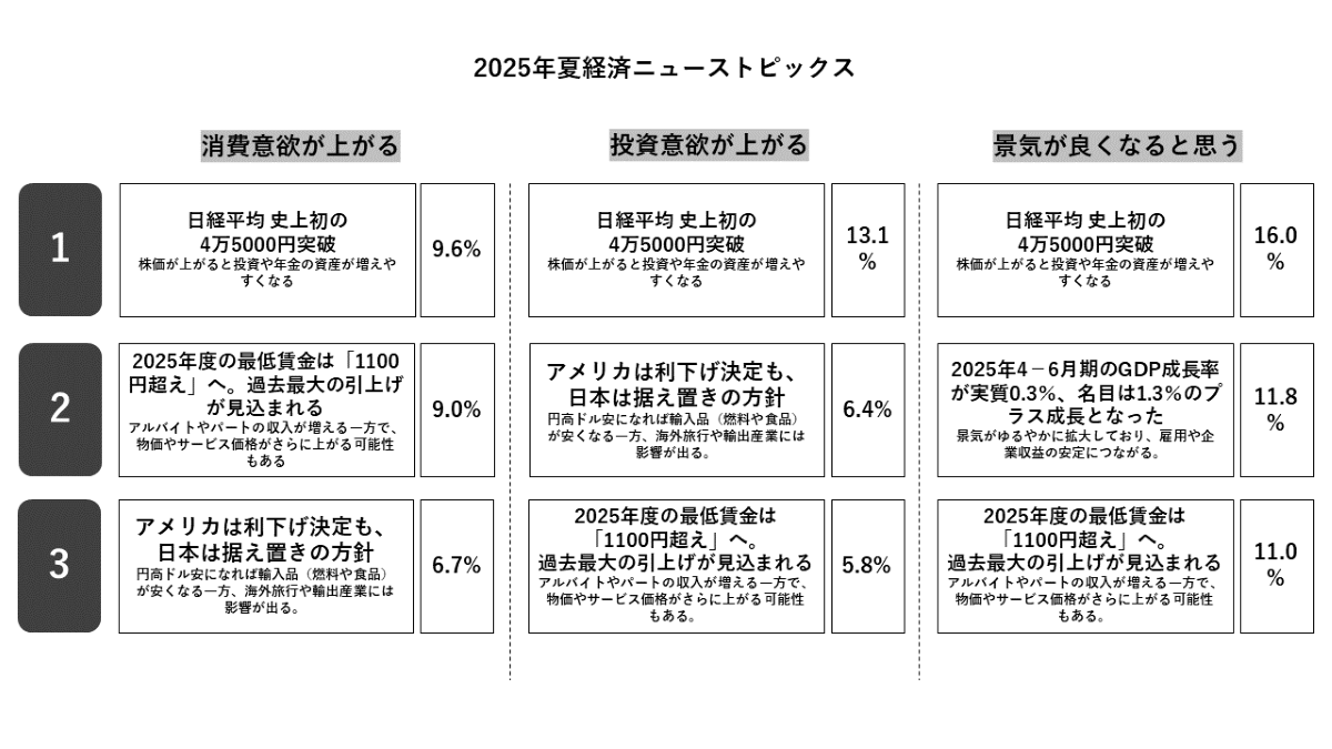 しかし、その中でも興味を持って反応している一定の層が存在しています。すこし見ていきましょう。今回、最も生活者の消費意欲/投資意欲を高め、景気が良くなると生活者が感じたニュースは、「日経平均4万5000円突破」のニュースでした。次いで、「最低賃金1,100円超え」「アメリカ利下げ決定」「GDPプラス成長」に注目が集まりました。日本経済にとってインパクトのある、史上初・GDP・最低賃金など、市場や株価がビビットに反応しそうなニュースが上位に君臨しました。