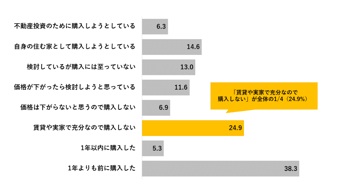 東京オリンピック前後から続く住宅価格の高騰は、多くの生活者にとって「今住宅を買うのは損」という感覚を定着させました。今回の調査結果を見ても、未だにその意識は強く残っていることが伺えます。「価格が下がれば買いたい」「価格は下がらない」という検討層以上に、「賃貸や実家で充分」と、初めから住宅購入を選択肢に入れていない層が全体の1/4(24.9%)を占めています。