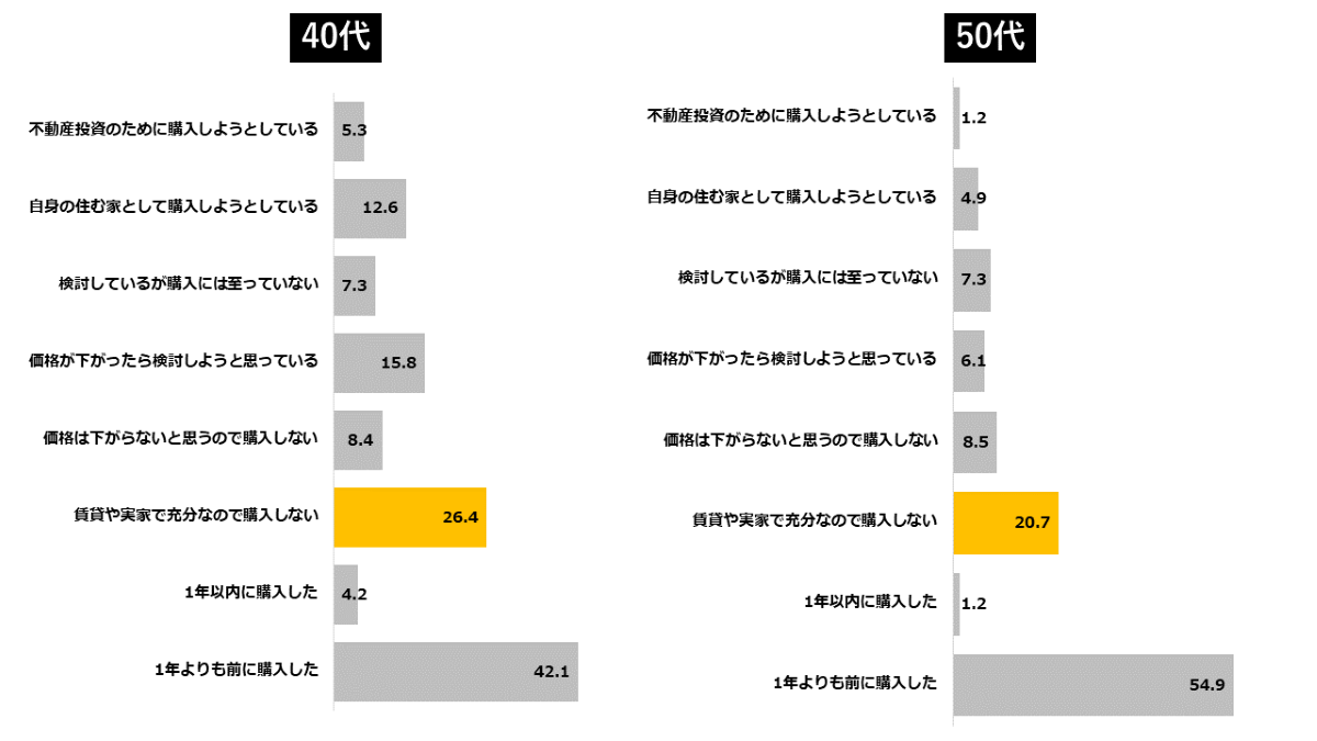 「賃貸や実家で充分」という意識は20代/30代の若年層に多いかと思いきや、世代別で見てみると、年齢に関わらず一定程度確立された意識であるということが分かります。