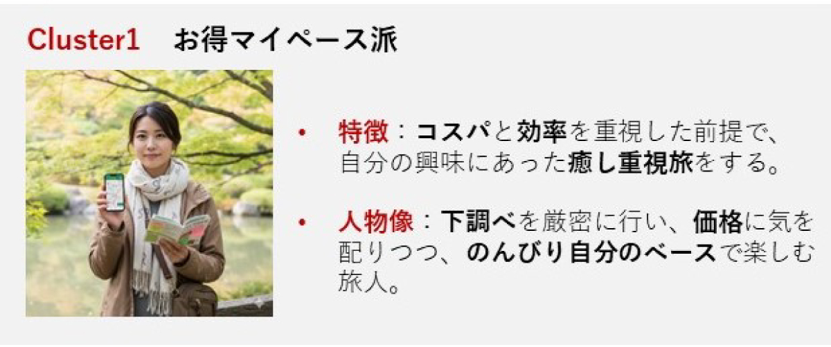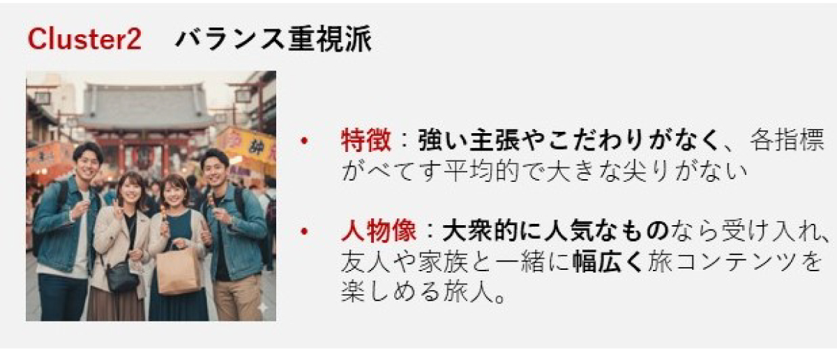 本調査では、各国の対象者に日常生活や旅行に対する意識を聴取し、その違いを因子分析によって整理し、訪日客を7つのクラスターに分類することができました。