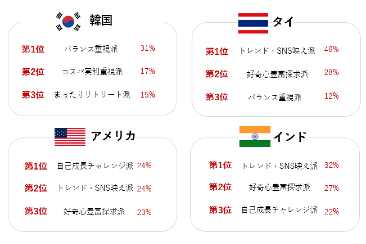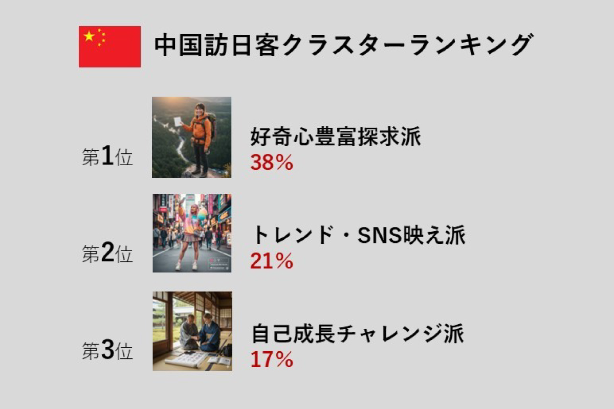 その中、中国訪日客のクラスター特徴が他のアジア諸国と異なり、 「好奇心豊富探求派」が1位、「トレンド・SNS映え派」が2位、「自己成長チャレンジ派」が3位となりました。特に好奇心豊富探求派の割合は38%で、対象国の中で最も高い数値となります。モノの消費だけでなく、知識や体験といった新たな価値へのニーズも高まりを見せています。