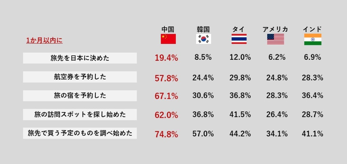 他国と比べると、中国人訪日客は旅行の決定・予約やプランニングの時期が総じて遅く、「思い立ったら行く」「直前に考える」といった旅のスタイルが目立ちます。