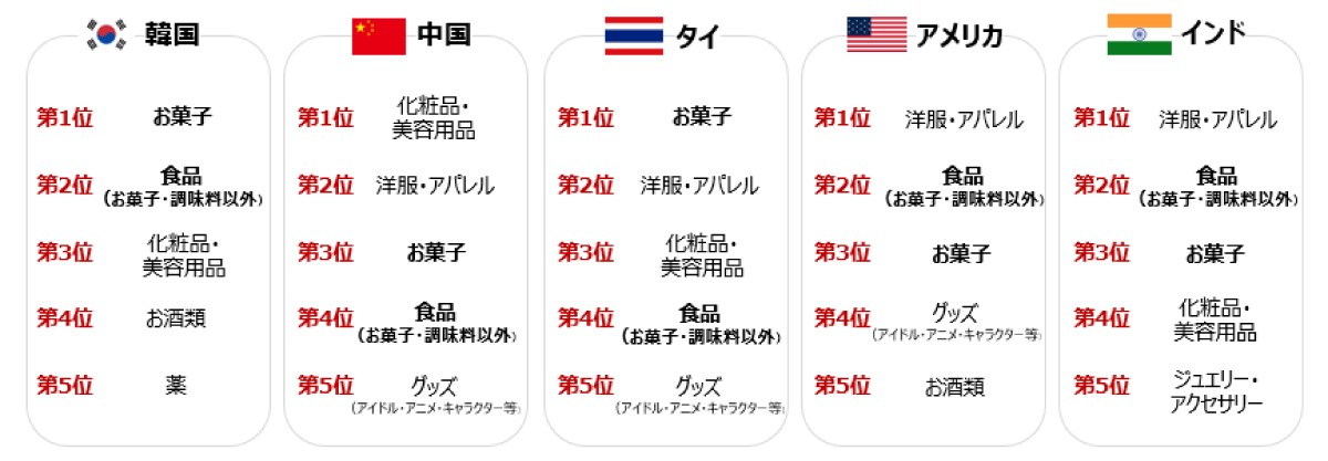 購入品の傾向を見ると、どの国でも「お菓子」「食品類」が上位2位に入り、特に東アジアでは「お菓子」が1位になる傾向があります。一方、中国では「化粧品・美容用品」が1位、「洋服・アパレル」が2位と、他国と異なる特徴が見られます。