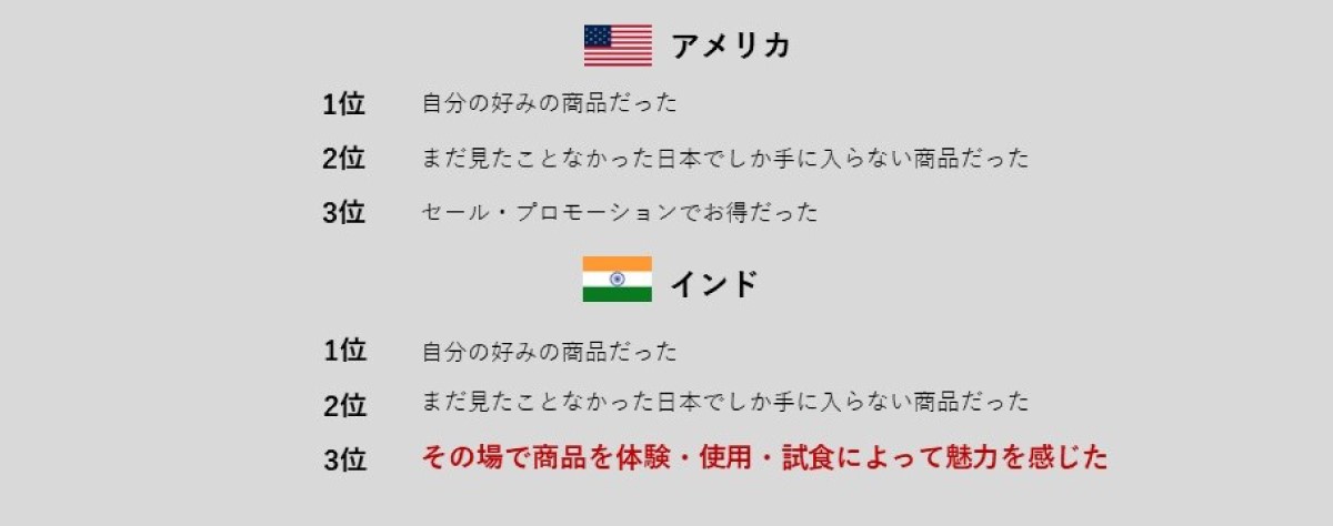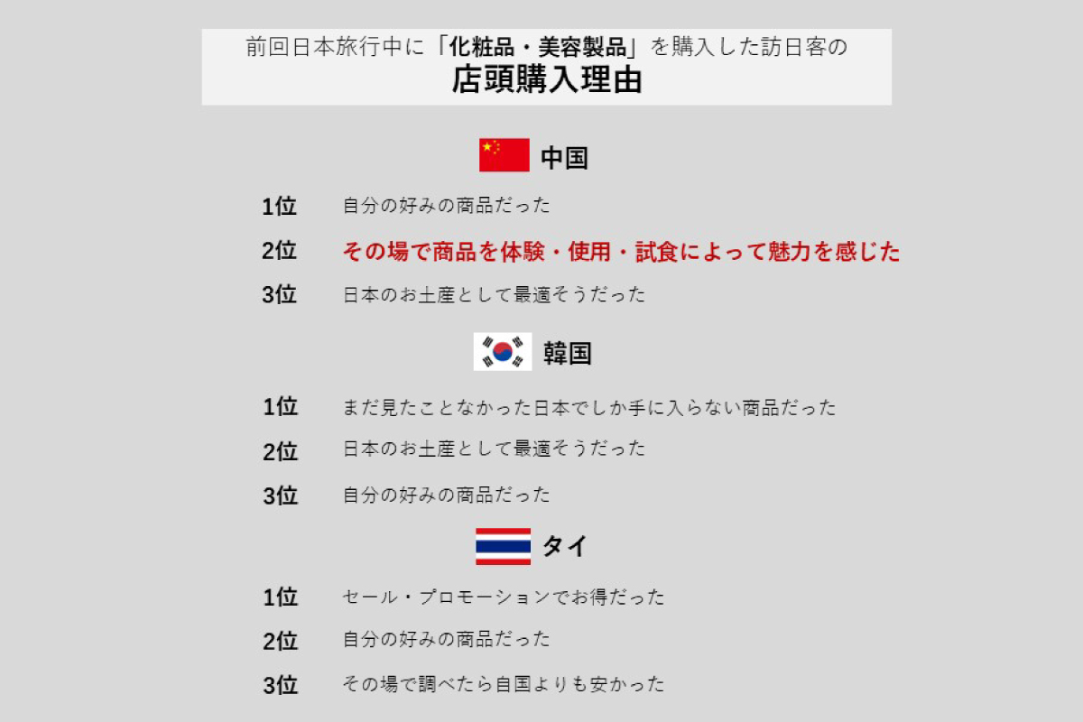 さらに、「化粧品・美容製品」を前回の日本旅行中に購入した中国人訪日客の店頭購入理由を見てみると、中国とインドのみで「その場で商品を体験・使用・試用して魅力を感じた」という項目がTOP3に入っており、店頭での実際のトライアルが化粧品購入の重要な決定要因となっていることが分かりました。