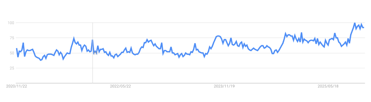 実際にGoogleトレンドで見てみると「蒸す」の検索数はここ5年間でゆるやかに上昇しており、5年前と比較すると約2倍になっていることがわかります。
