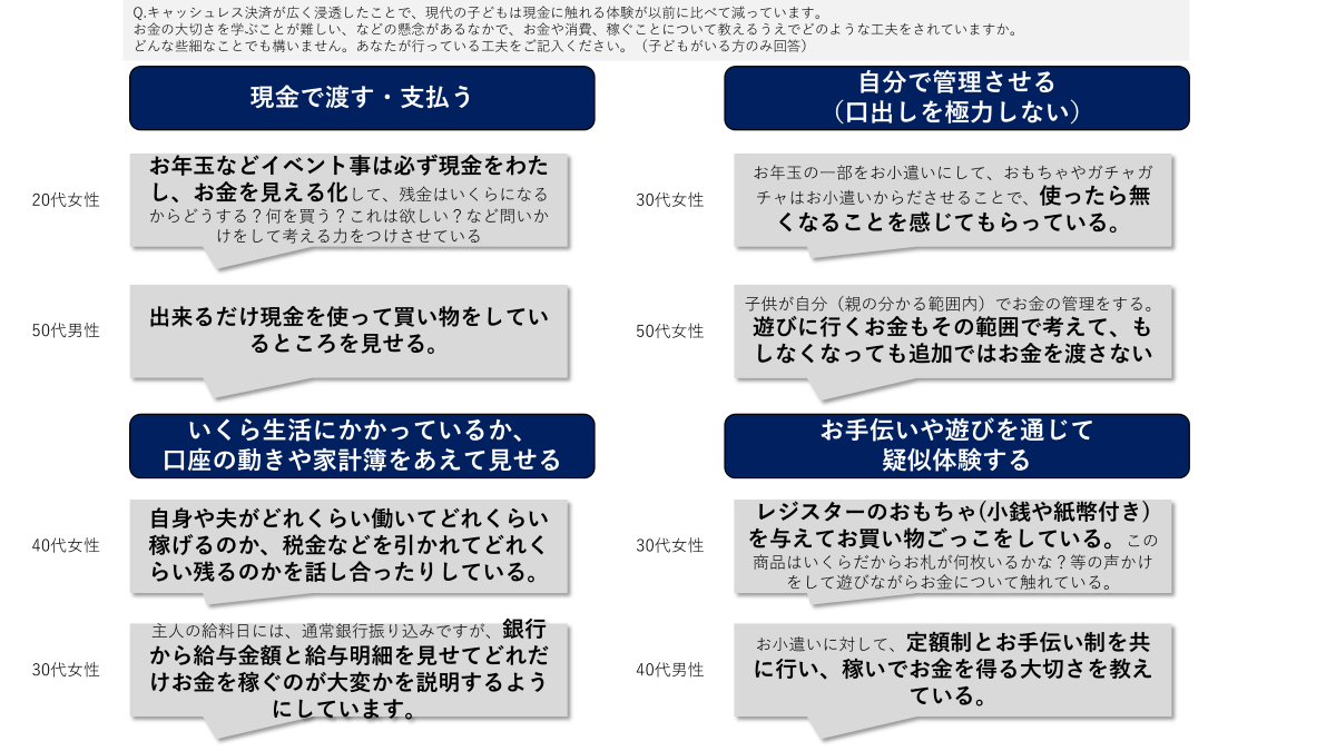「現金で渡す」ことで、お金を具現化して見せ、概念ではなく実体であることを実感する。