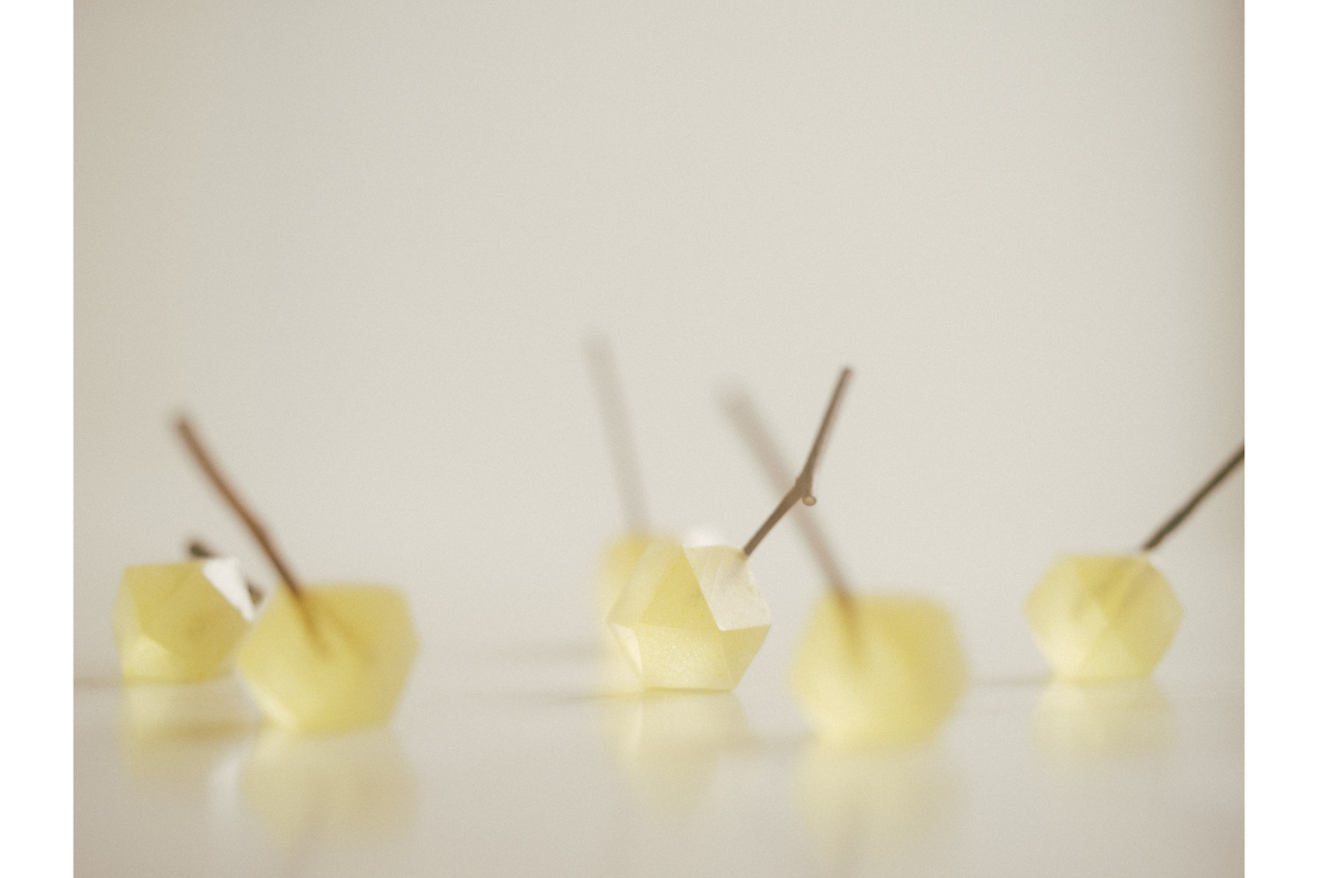 最初は実際の木の枝に餡入りのお団子をつけてみたのですが、それだと重力に負けて落ちてしまう。これは、“なっていない”状態です。ところが、試行錯誤の中で琥珀糖を使ったところ、うまくいきました。琥珀糖って最初は寒天で、周りが結晶化することで琥珀糖になるのですが、それがしっかりと枝を抱え込むように接着したんです。