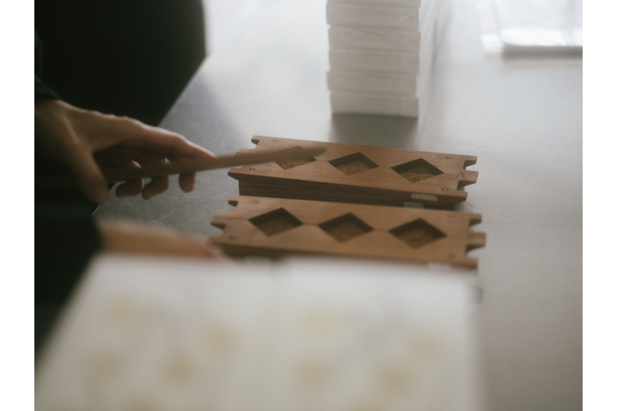 架空の花を組み合わせた模様である宝相華は、仏教美術にもよく使われています。そうした部分も汲み取って、彫刻のプロが彫ってくださった型は、お菓子というプロダクトに不思議な神聖さを与えてくれました。