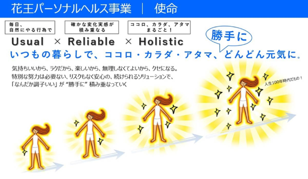 2024年に花王のパーソナルヘルス事業のミッション・ビジョンづくりをお手伝いしたのですが、そこに出てくる「Usual」「Reliable」「Holistic」という言葉も、もともと花王さんで使われてきた言葉と、担当者ご自身から出てきた言葉だけを使っているんです。