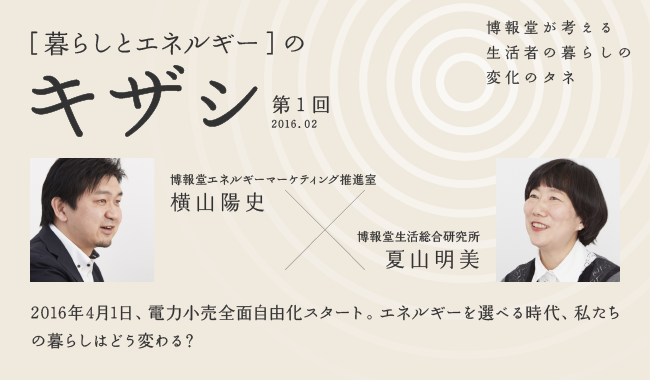 第一回目は、博報堂エネルギーマーケティング推進室・横山陽史(よこやま・はるふみ)と、博報堂生活総合研究所・夏山明美(なつやま・あけみ)が、2016年4月1日からスタートする「電力の小売自由化」をテーマに語ります。