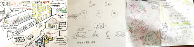夏山:私たちの研究所では、未来を予想するための様々な調査をしています。昨年11月に「2016年以降、話題になったり、普及・浸透していそう」と思うものをリストから選んでもらう調査をしました。上位に挙がったものは、自動衝突回避システムや電気自動車、実用型ロボット、音声認識アシスタントなどです。おそらく、このような予想の裏には、生活者の皆さんの期待もあると思うんです。さらに、10年後の街を描いてもらったお絵かき調査(下記参照)や、街で見つけた未来のきざし写真調査でも、自動運転や一人専用の乗り物、太陽光発電システム、自転車エスカレーターなどが登場しました。生活者の皆さんの心の根っこに「電気で未来の暮らしが便利になればいい」という思いがあるようです。