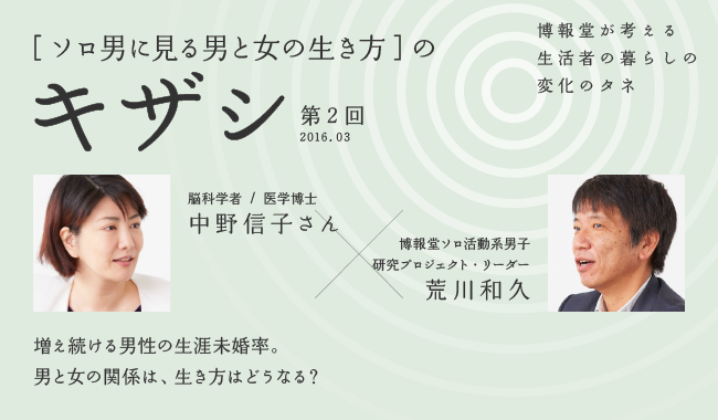 第ニ回目は、脳科学者で医学博士の中野信子さんをゲストに、博報堂ソロ活動系男子研究プロジェクト リ―ダー・荒川和久(あらかわ・かずひさ)が、増え続ける「ソロ男(ソロダン)に見る男と女の生き方」をテーマに語ります。