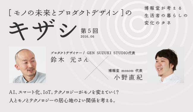第五回は、プロダクトデザイナーの鈴木 元(すずき・げん)さんをゲストに、博報堂のプロダクト・イノベーション・チーム「monom」代表・小野直紀(おの・なおき)が、これからのプロダクトデザインについて語ります。