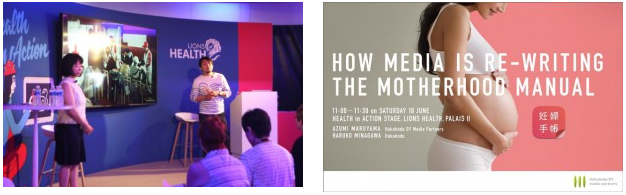 「ライオンズヘルス」初日に、博報堂DYメディアパートナーズはカンヌ初となるセミナーを主催しました。「How Media is Re-writing the Motherhood Manual」と題したこのセミナーでは、妊婦向けアプリ『妊婦手帳』を紹介しました。妊婦手帳は、博報堂DYメディアパートナーズが、NTTドコモと共同開発した、産科と連携した妊娠中の不安を軽減する妊婦向けラーニングサービスです。