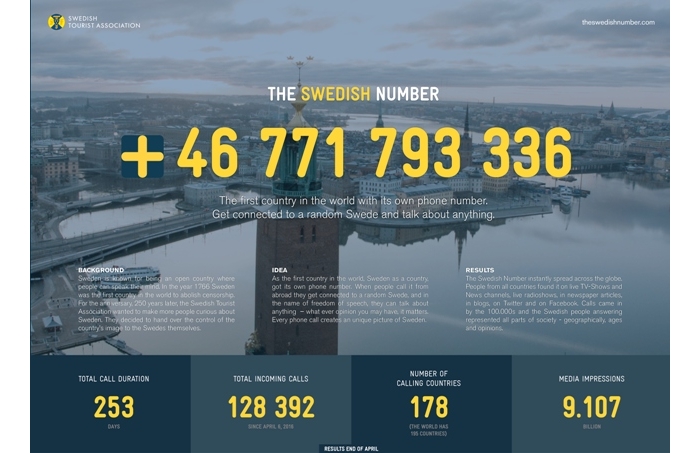 (3)Sweden 「The Swedish Number」(スウェーデン人がランダムに観光案内してくれる電話番号) サイバー部門ゴールド