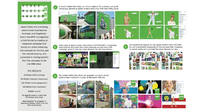 米MTVによる恒例のビデオミュージックアワードを活性化するために、アワードの事前広告はすべて緑の背景による「未完成の素材」として掲示しました。その上で、ユーザーが自由に背景を編集できるようにして、本番の広告として紹介。誰もが映像を作れるようになってきた時代のファン巻き込み施策だと言えます。