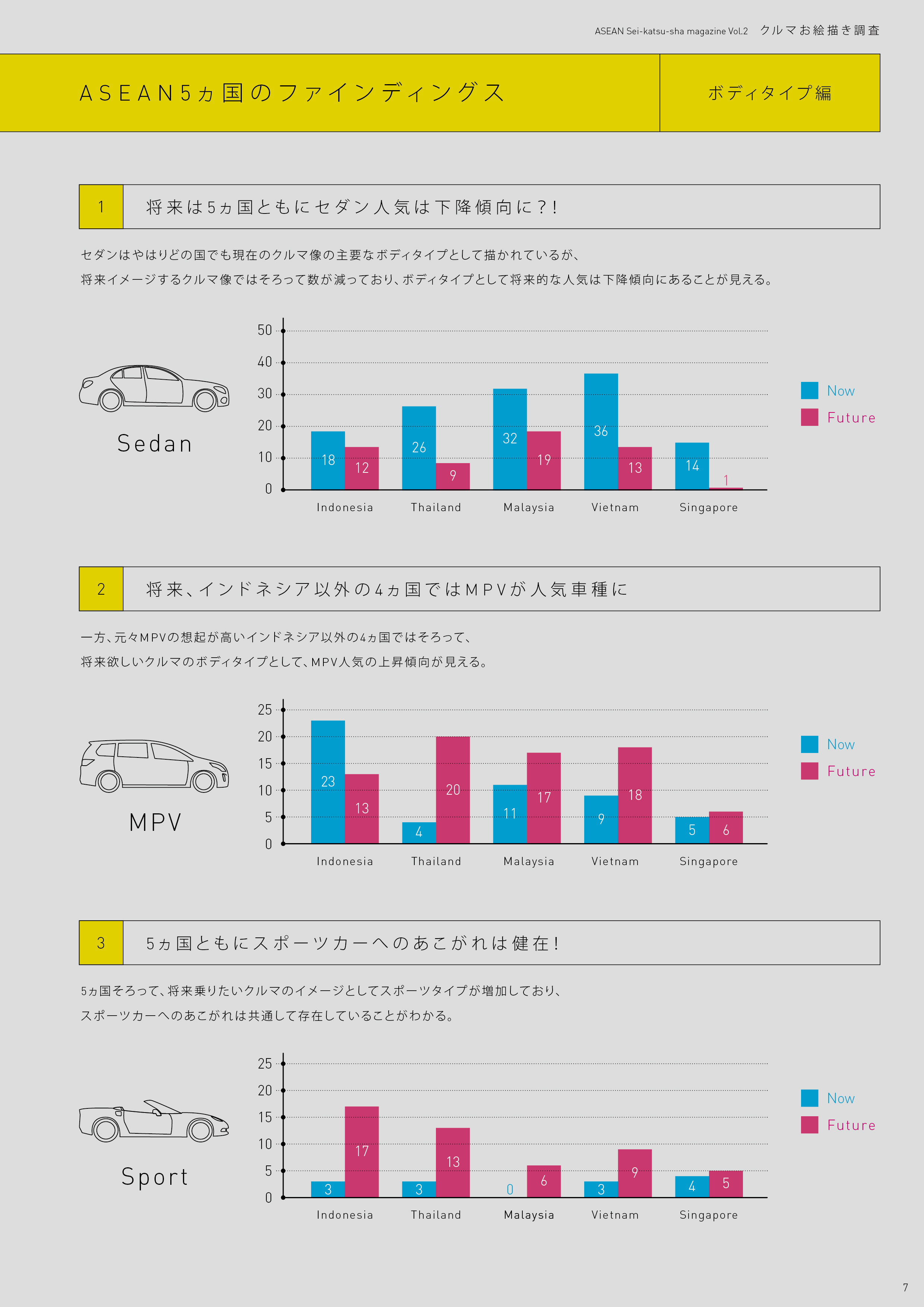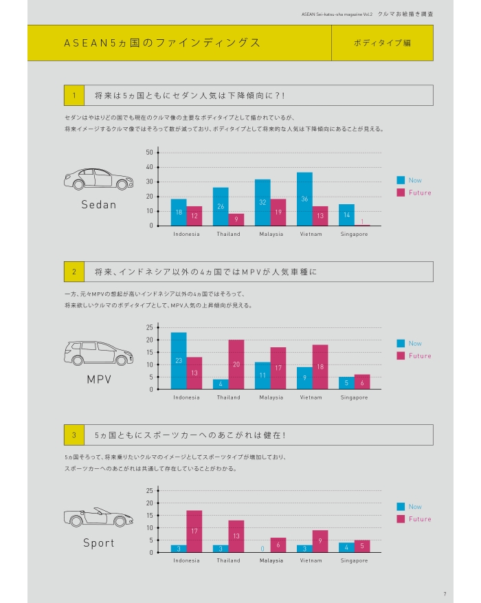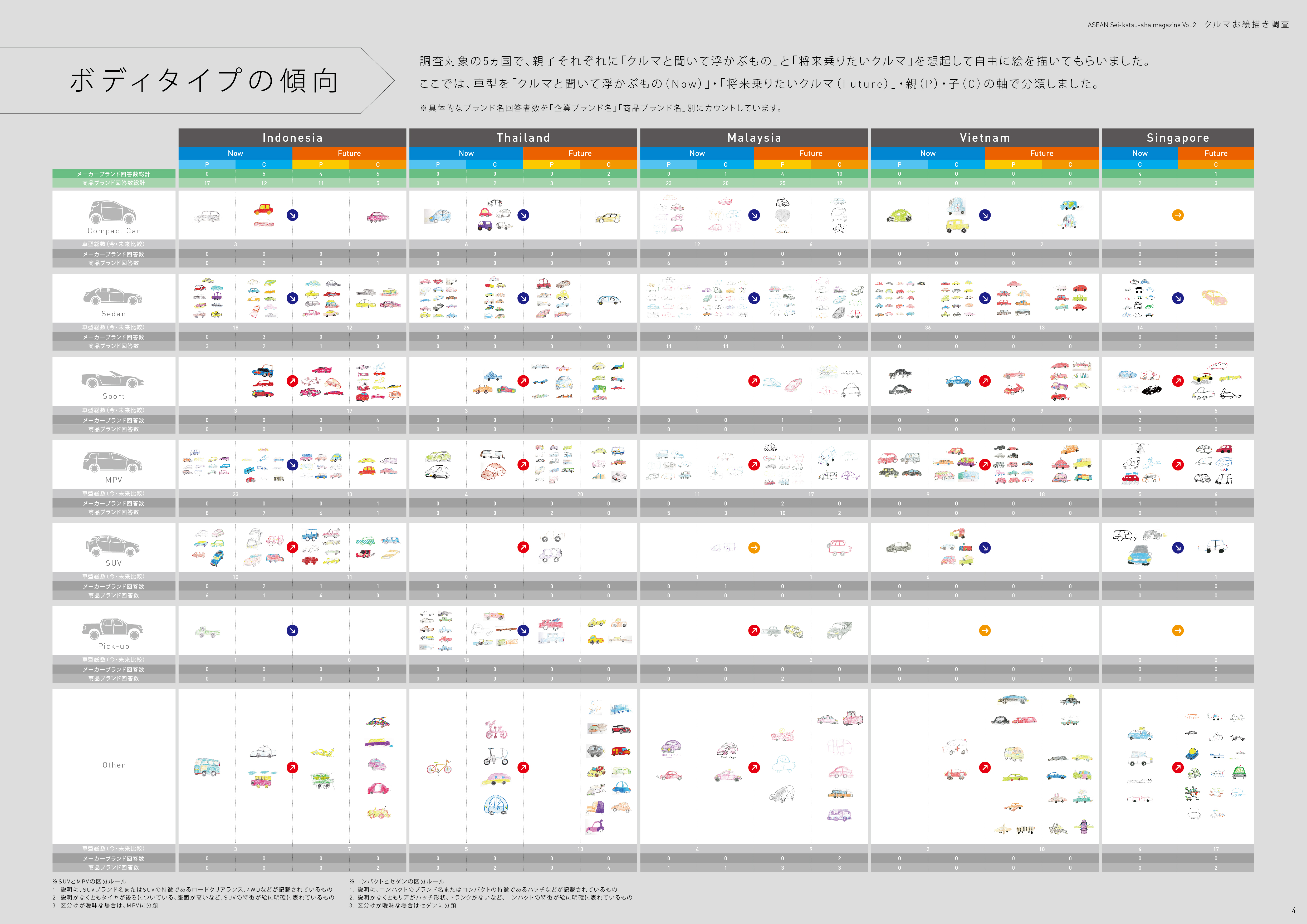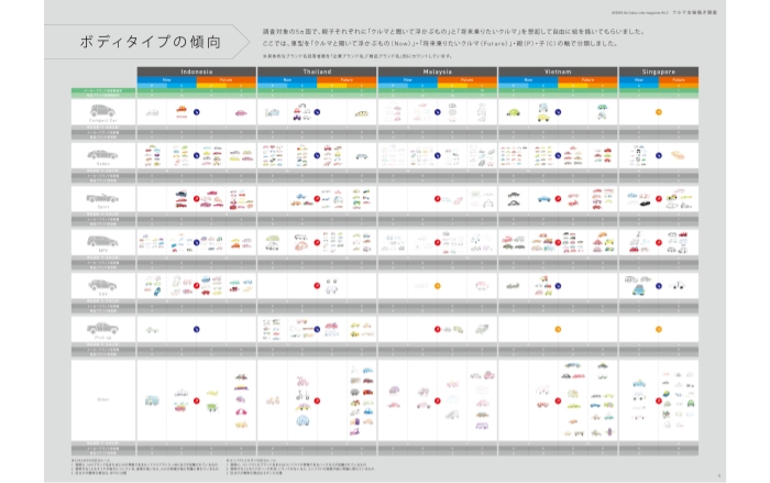 ASEAN全体では日本の子供たちと同じく、MPVの絵が増加し(インドネシアを除く)、セダンの絵を描く子供は減少傾向と出ました。しかし、スポーツカーへのあこがれが根強いのはASEAN成長のパワーを象徴しているような気がします。実際、私の周りの現地スタッフに聞いてもスポーツカーへのあこがれは日本より強く感じます。
