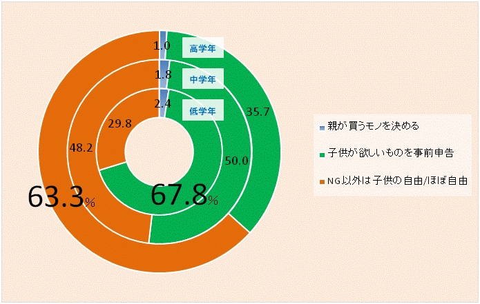 男の子は「申告させて親が判断する」が半数を超えていて特徴的です。ママに聞いた調査なので、ママがOKと思うものと男の子が欲しがるものにギャップがあるのかもしれません。うちの息子が小学生だった時は、ゲームセンターのカードが出てくるゲームが好きでした。おこづかいなんだから自由にさせてあげたいと思っていても、湯水のように消えてしまう使い方が気になって、ついつい口を出しちゃうんですよね。そのカードは私にとって100円分の価値はなく、ほしがる意味が分からない、、放っておくとアッという間に全額使ってしまいそうで「本当にそれでいいの?よく考えて使ってほしいんだけど」と。「どうせ当たりカードは簡単に出ないよ」と言ったら、「ママはひどいこと言う!」と怒られました(笑)。