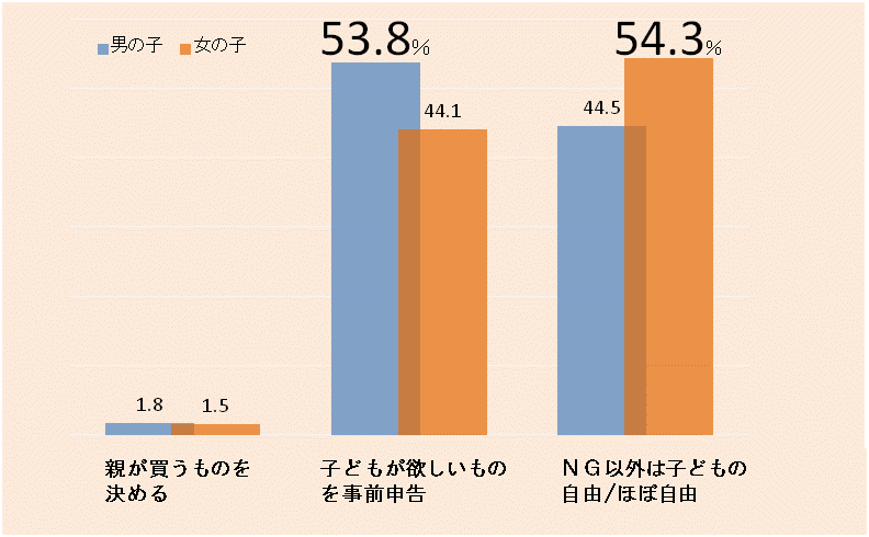 男の子の方が衝動的だから、ちょっと制限をかけてあげた方がいいんですかね。ある種のクールダウン的なことかもしれません。自由度=信頼度だと思うので、そういう意味では女の子の方が信頼できるんじゃないですかね。買った後のことを見ているとわかるんですが、女の子の方が飽きっぽくないというか、ちゃんと使っていたり大切にしているような気がします。