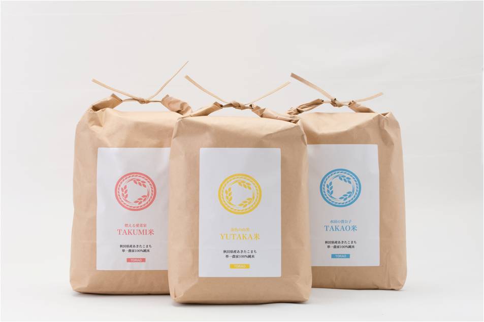 「トラ男」とは、トラクターに乗る男前農家集団のこと。秋田県の専業農家の3代目である3人の「つくり手」と、彼らの思いを伝える1人の「つたえ手」(武田さん)、4人のチームです。3人の農家が丹精込めて作ったお米(=「トラ男米」)は、それぞれ「TAKUMI米」「YUTAKA米」「TAKAO米」と名付けられ、単一農家100%の純米として、主にWEBサイト「torao.jp」で販売されています。