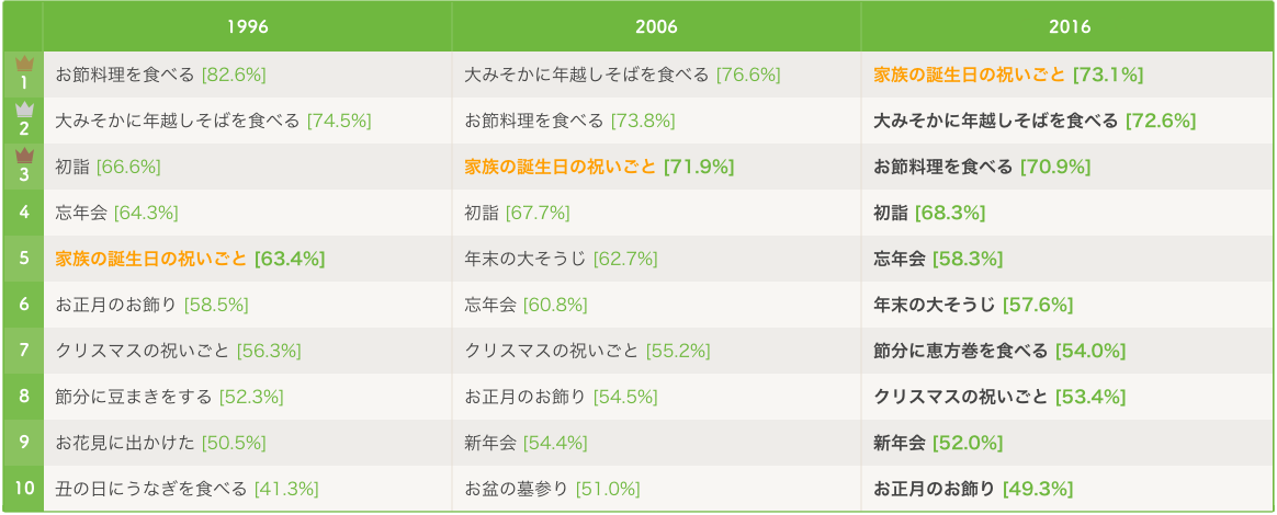 2016年に1年以内の年中行事のトップに躍り出た、「家族の誕生日の祝いごと」だ。この1年以内に「家族の誕生日の祝いごと」をした人は、73.1%。20年で9.7ptも増えている。