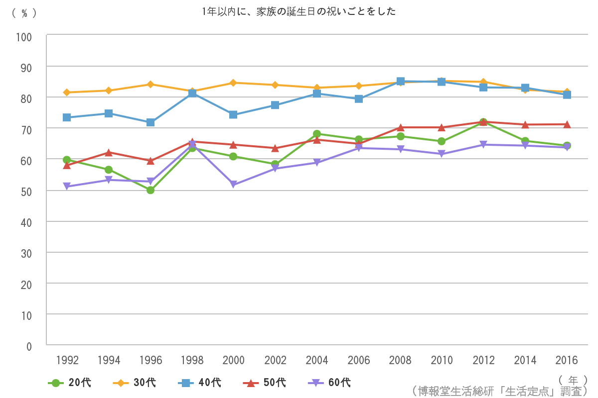 「家族の誕生日の祝いごと」をした人を年代別でみると30代40代が高水準をキープしており、2008年以降は80%超えとなっている。子どもの誕生日を祝うパパママが含まれるからだろう。