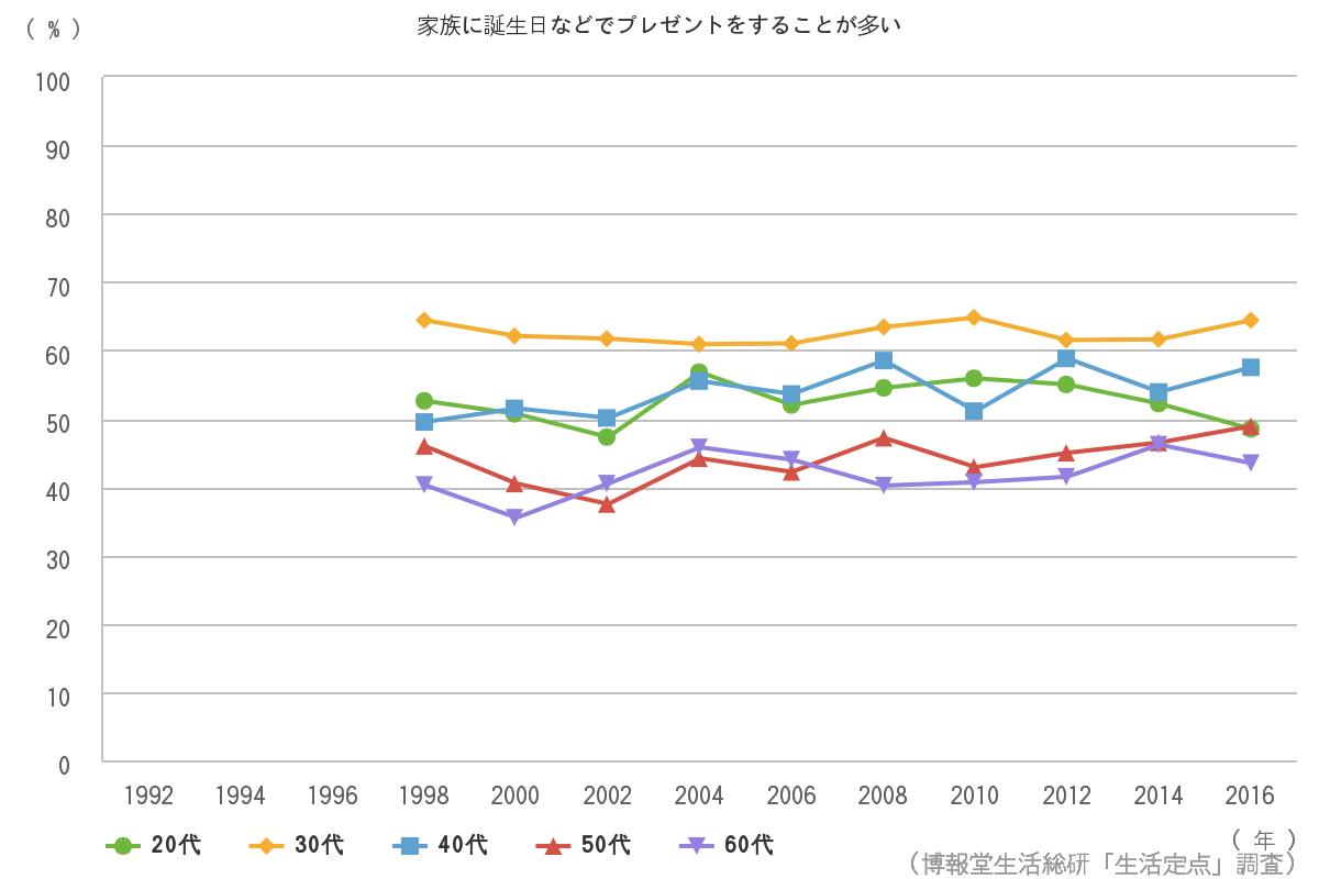 「家族に誕生日などでプレゼントすることが多い」は、2000年くらいから少し伸びて53.1%。先ほどのデータと同様、子育て家族の多い30代が年代別トップ、次いで40代だ。