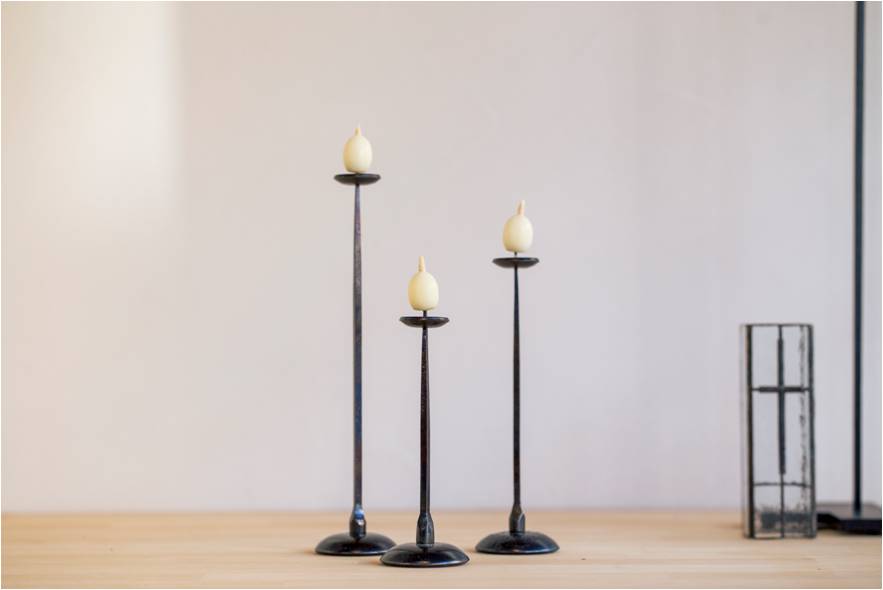 小藤:作品の6割くらいは、テーマを持ったものになっています。たとえばこの3つの燭台は、家族をイメージしています。単品でも販売していますが、3つ揃うと、父、母、子の姿になる。別々に飾っていてもいいし、何かの折には寄り添わせて、灯りをともしてもらえれば。また、あるとき娘さんを亡くされたお母さんがいらして、燭台を買っていかれたことがあって。そのお母さんの姿がすごく印象的だったので、この燭台は、娘さんのことを思って灯りをともす、お母さんの祈りの姿をイメージしてつくりました。