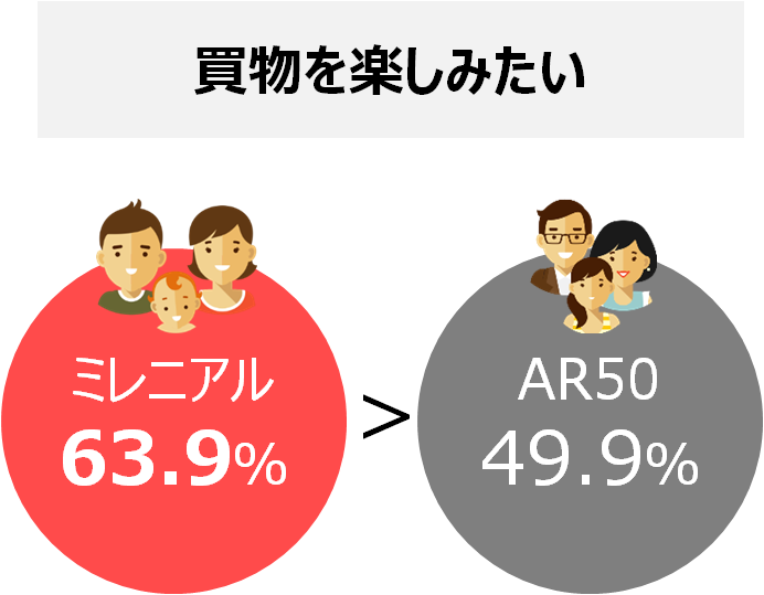 以上、ミレニアル家族を動かすポイントとして「買物による幸せのつくり方」を見てきました。「買物を楽しみたい」という意識がアラウンド50世代の家族よりも14ポイントも高いミレニアル家族。ただ「楽しむ」だけではなく、その楽しみ方も工夫することで、非常に高い「幸福度」を支える買物をしていたのです。