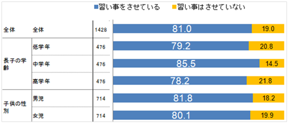 データをみると、高学年ほど習い事が増えるかと思っていたのですが、むしろ若干減るんですね(79.2%→78.2%)。