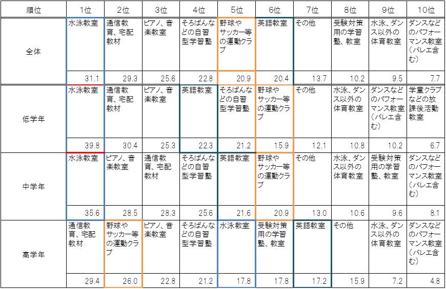 長男には「プール(1位)」と「自習学習塾(4位)」に、次男は親子プールのみに通わせています。しっかりランキング上位をおさえてますねw。