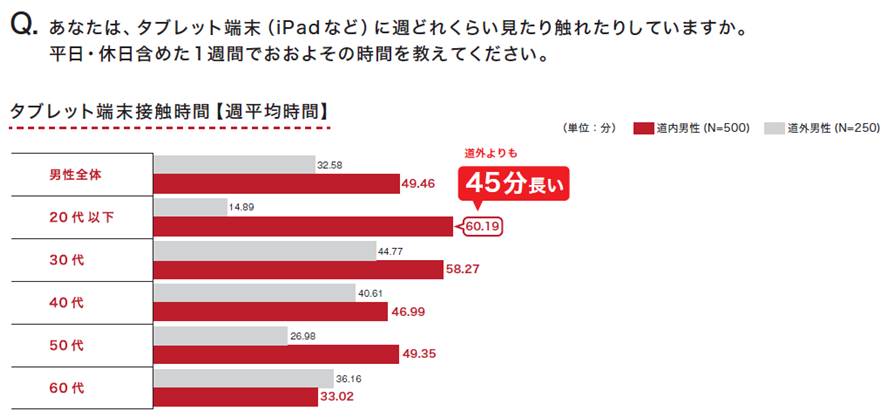 タブレット端末の接触時間は、道内対象者の男性で長い傾向です。週平均49.46 分で、道外対象者の男性より16 分程度長くなっています。20 代以下・30 代で顕著で、20 代以下では週平均60.19 分と、道外対象者の男性20代以下よりも45 分長くなっています。
