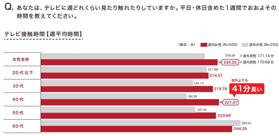 また、テレビの視聴時間は、道内外ともに女性のほうが男性より全体的に長い傾向ですが、道内対象者の女性でより顕著な傾向が出ていました。週平均の視聴時間で、道内女性60 代を除く全世代で道外対象者の女性を上回っており、また、年代が高い方ほど視聴時間は長い傾向にあります。特に40代女性に顕著で、道外対象者の女性週186.28分より、道内女性が週227.47分と41分長くなっています。