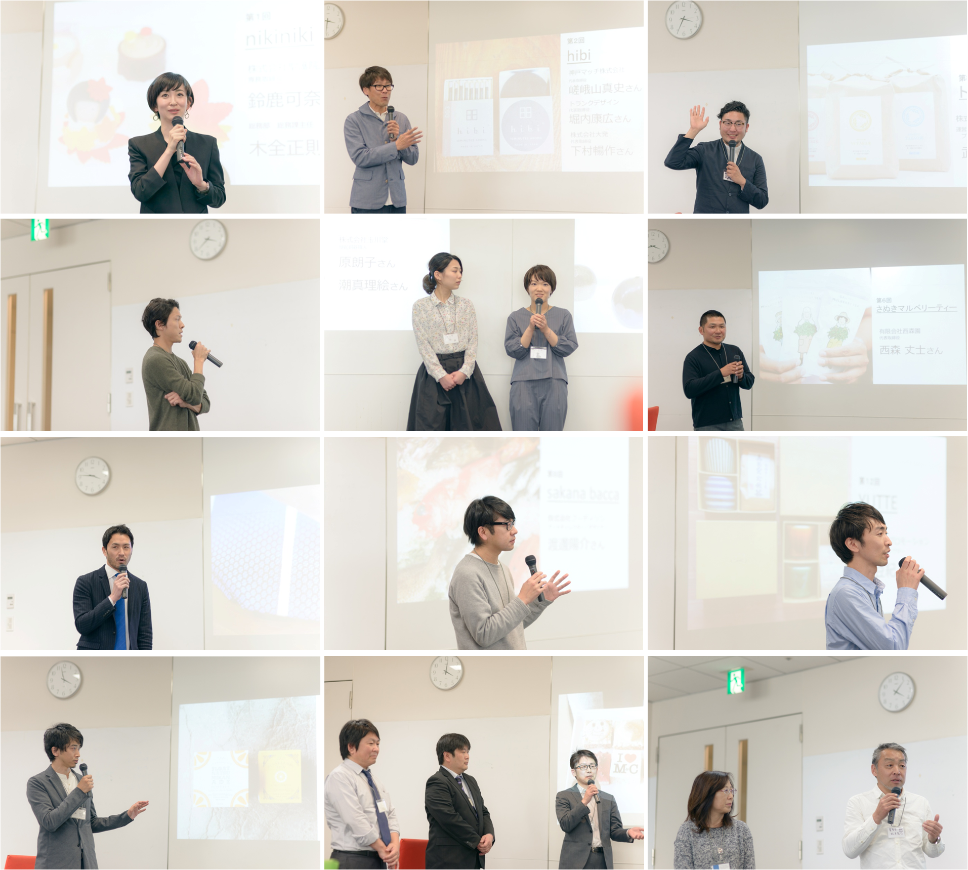 当日お集まりいただいたのは、これまで訪ねた17のブランドのうち、「nikiniki(ニキニキ)」「hibi(ヒビ)」「トラ男米」「HAPPY NUTS DAY(ハッピーナッツデイ)」「フラワーボール」「さぬきマルベリーティー」「KUSKA(クスカ)」「sakana bacca(サカナバッカ)」「YUTTE(ユッテ)」「フロートレモンティー/フロートナツミカネード」「マシュー&クリスピー」「コヘッツイ」計12のブランドの担い手さんたち。