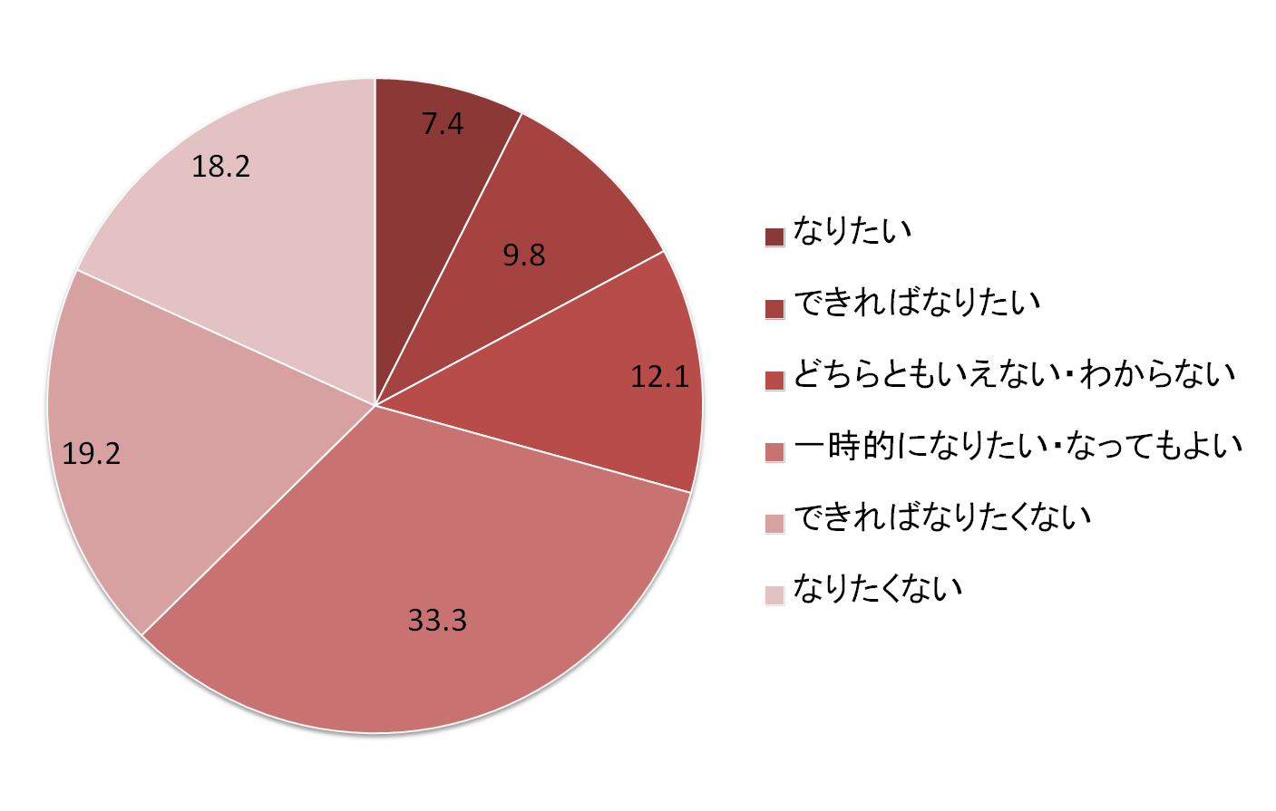 そんな「働かざるを得ない現実」にある女性たちのデータをみていると、キャリジョ研の打ち合わせは盛り上がり、「専業主婦になりたい女性は多いに違いない」、「駐妻(海外駐在についていく妻。通称チューヅマ)とか憧れるなぁ」、「半沢直樹の奥様みたいな女性こそモテるはず」、「昼顔みたいなのもアリ?!」なんて雑談や安直な仮説を重ねていたのですが、調査を進めると、私たちの仮説とは真逆のデータに直面しました。なんと「専業主婦になりたい」人は、僅か17.2%。本当はそこまで憧れていないのです。一方「なりたくない(働きたい)」は37.4%でした。ちなみに「一時的になってもよい」という、少しは専業主婦を覗いてみたいけど最終的には仕事を持ちたい、というちゃっかりタイプが33.3%と意外にボリュームゾーン。いずれにしても、「生活のため」にイヤイヤ働いているのではなく、別のモチベーションがあるようなのです。