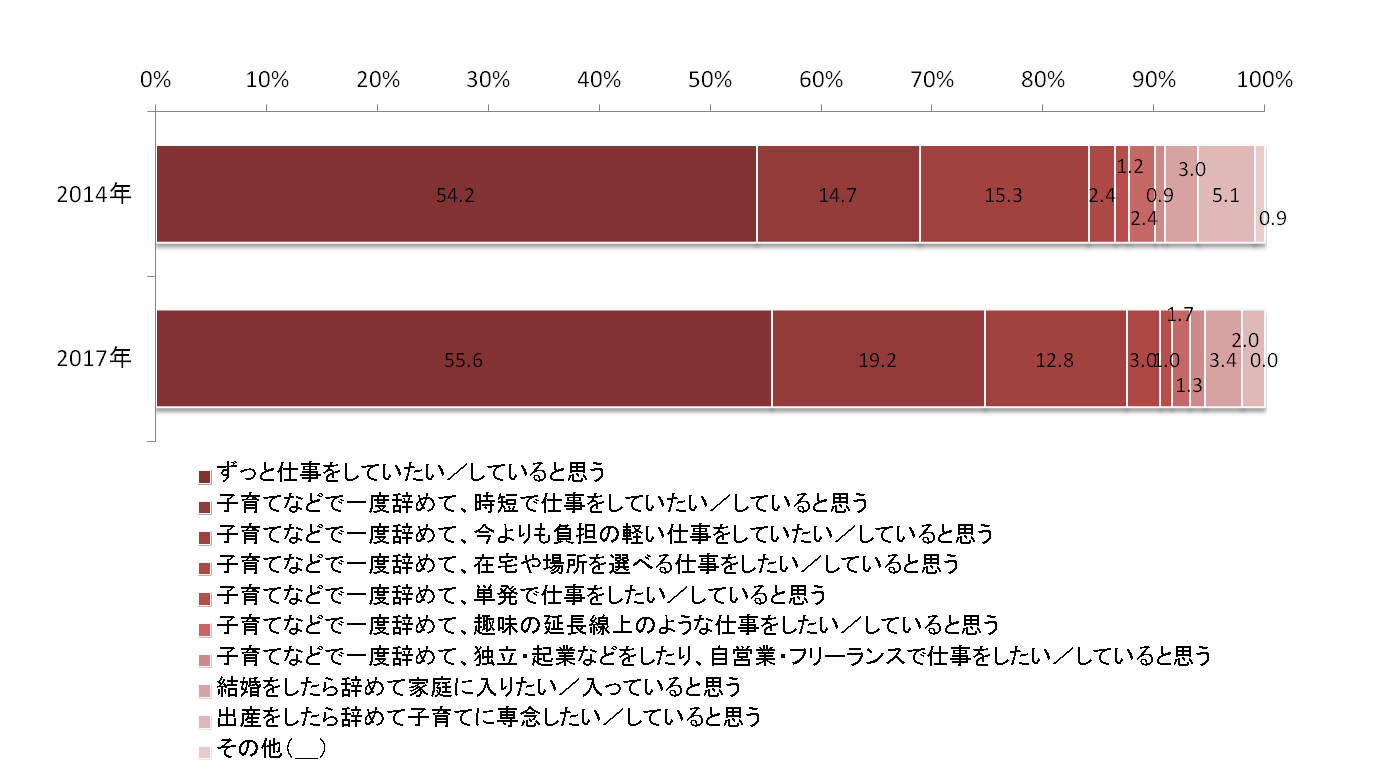 ちなみに、この3年間で減った「働く理由」は、「再就職は大変だから・もう同じような仕事に就けないと思うから」、「仕事をするといろいろな人とのつながりを持てるから」、「仕事をして人や社会のために役立ちたいから」。政府の施策のおかげもあり、女性支援系の制度も整い始めているし…SNSで繋がりもあるし…と、インフラを巧みに活用する様子がうかがえますし、一時期の社会貢献ブームも一周して、もっと実直に、仕事に結婚に出産に自分のありたい将来を得るために今を戦略的に生きたい!という本音が見えてきます。